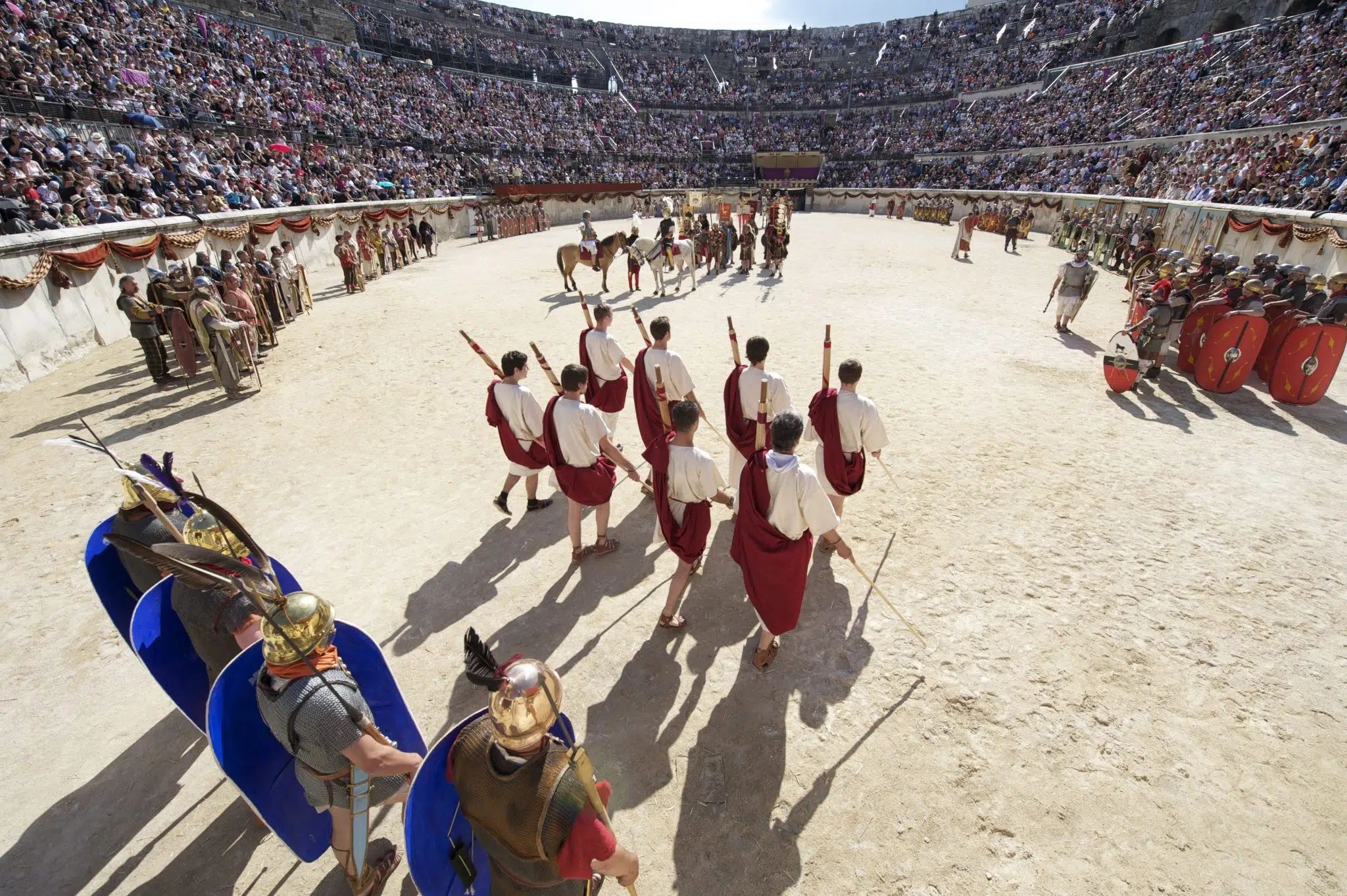 Nowadays, the performances at the Arena of Nîmes offer a highly varied programme, at the crossroads of ancient history and modernity. One of the most emblematic events is the Grands Jeux Romains, a spectacular event in which around 250 artists from all over Europe re-enact scenes from gladiatorial combats, chariot races, imperial parades and military demonstrations in the arena.